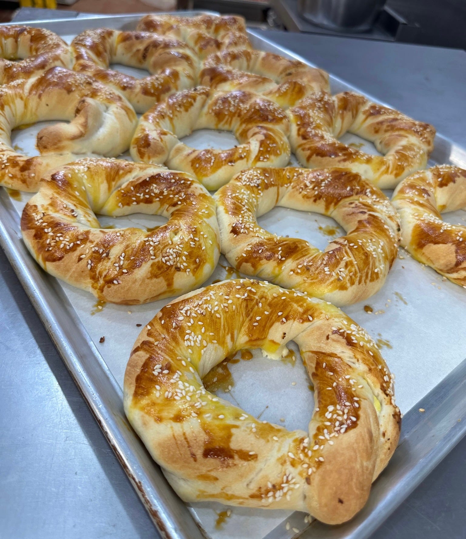 The açma is also bagel-shaped and described as a “Turkish bagel” on the menu. Softer than simit, the bread is filled with cheese and topped with just a smattering of sesame seeds. It is also served with Turkish tea. As with the simit plate, you can add various accouterments.