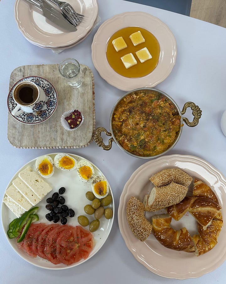 Meanwhile, menemen is a classic Turkish dish of scrambled eggs with tomatoes, peppers and onions. It also comes with fresh bread and a glass of traditional Turkish tea.